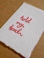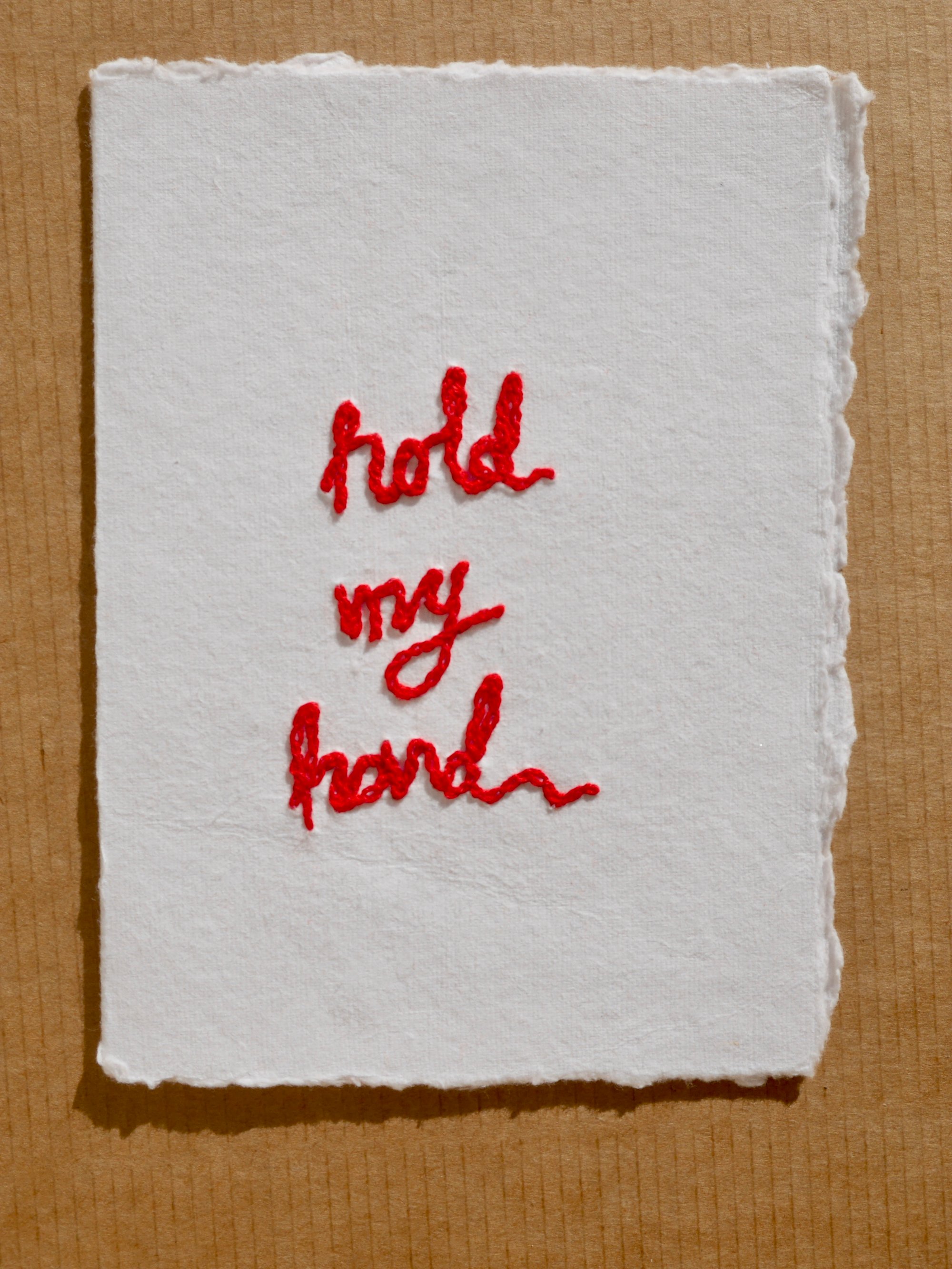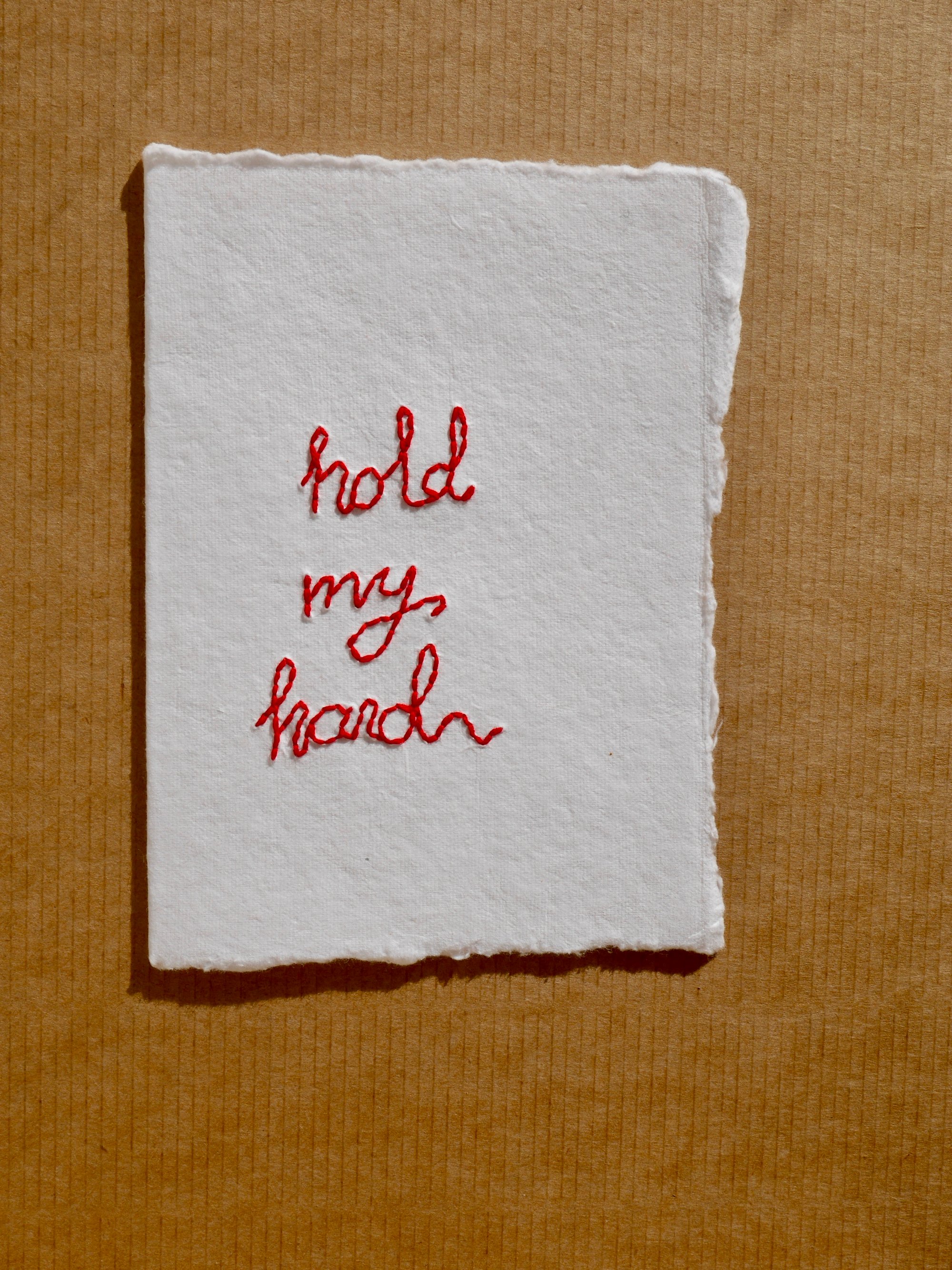 Handmade card, hand embroidered with 'hold my hand' in signature red.