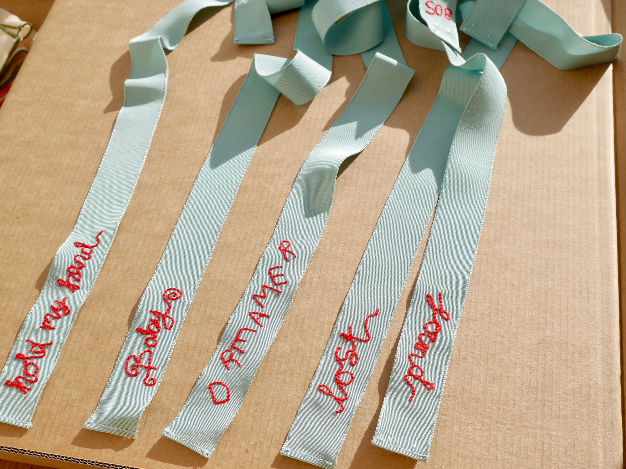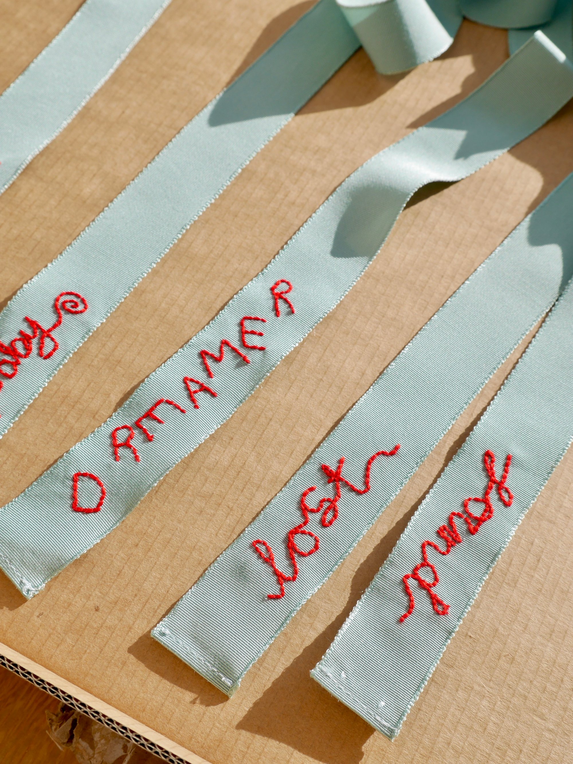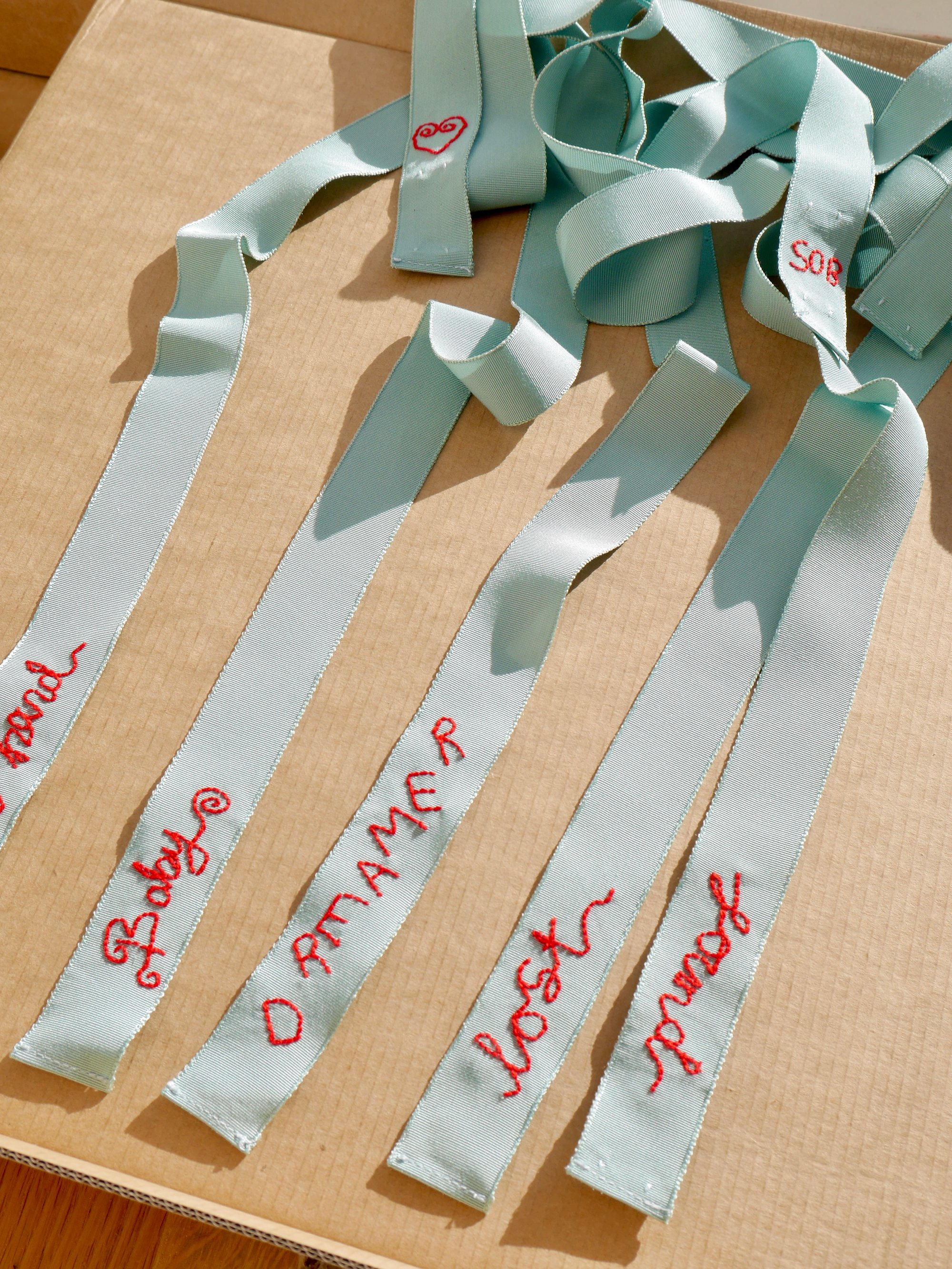 Made from vintage silk petersham ribbons, with the most exquisite edging. Hand embroidered with a 'Lost' at one end & 'Found' at the other, in signature red.