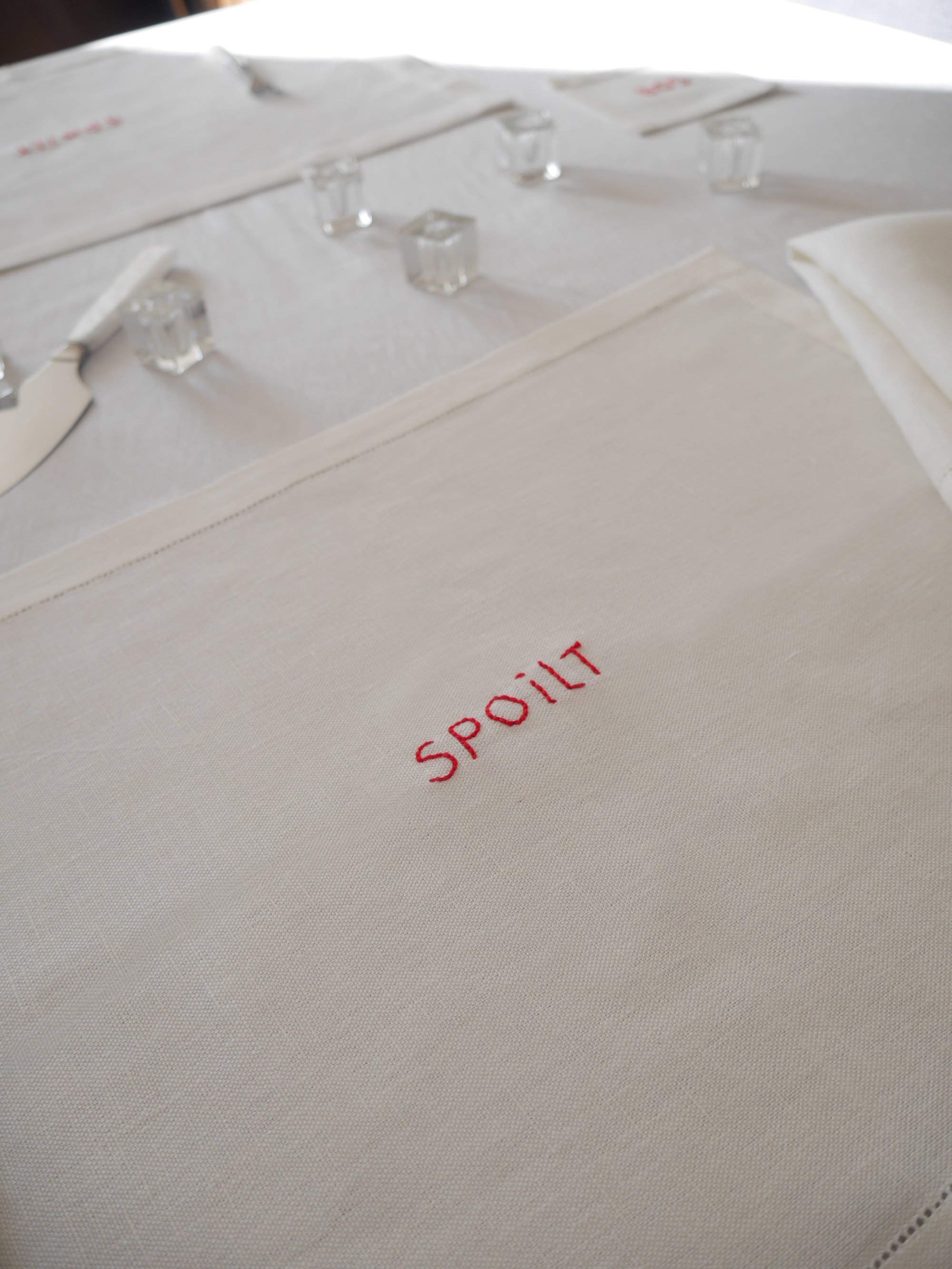 Each placemat is meticulously hand-embroidered with the word Spoilt — a playful yet refined detail that brings a touch of poetry and humour to your table setting. Every piece bears its own unique charm and artisanal character, a testament to the hand of the maker.