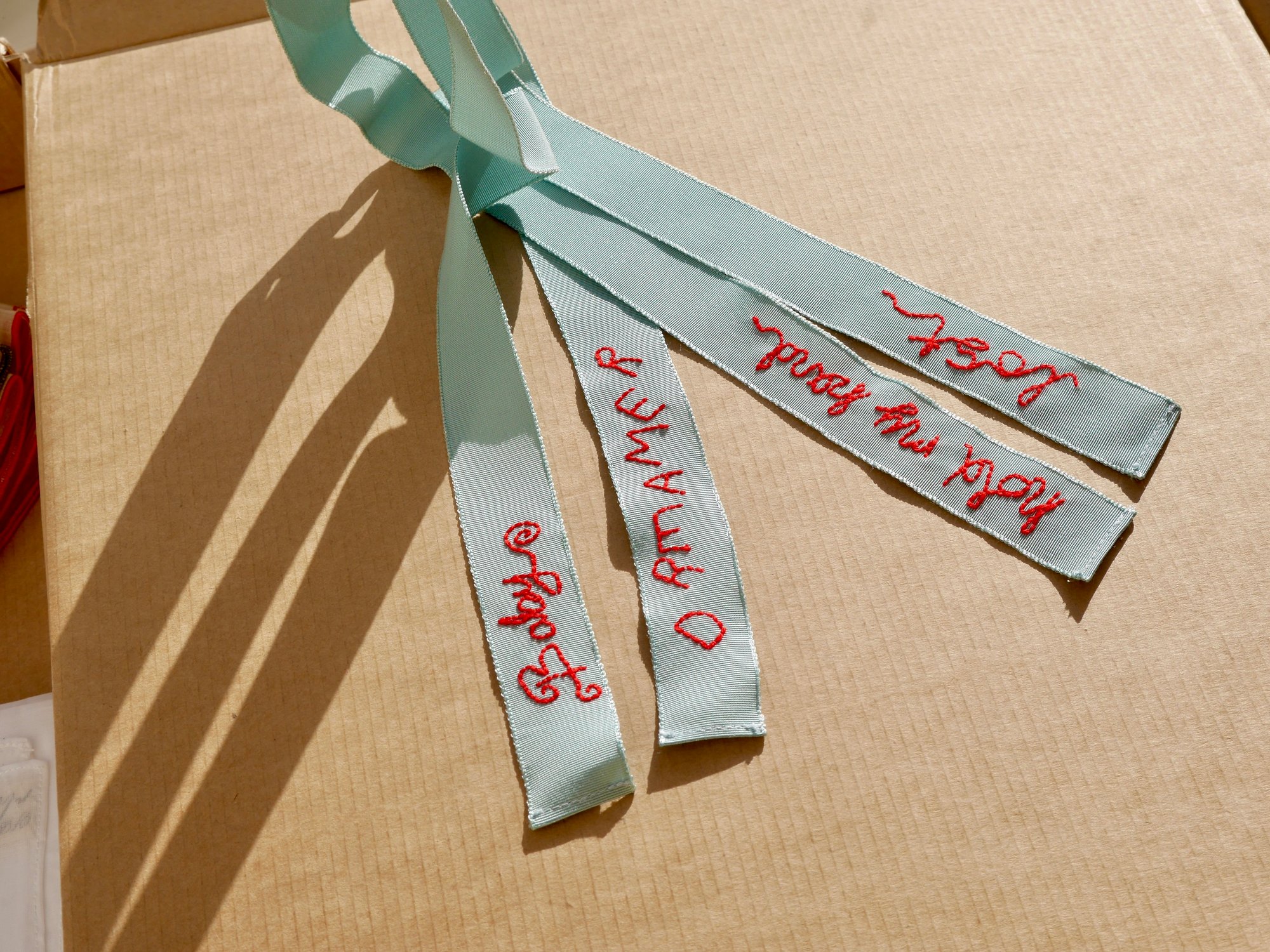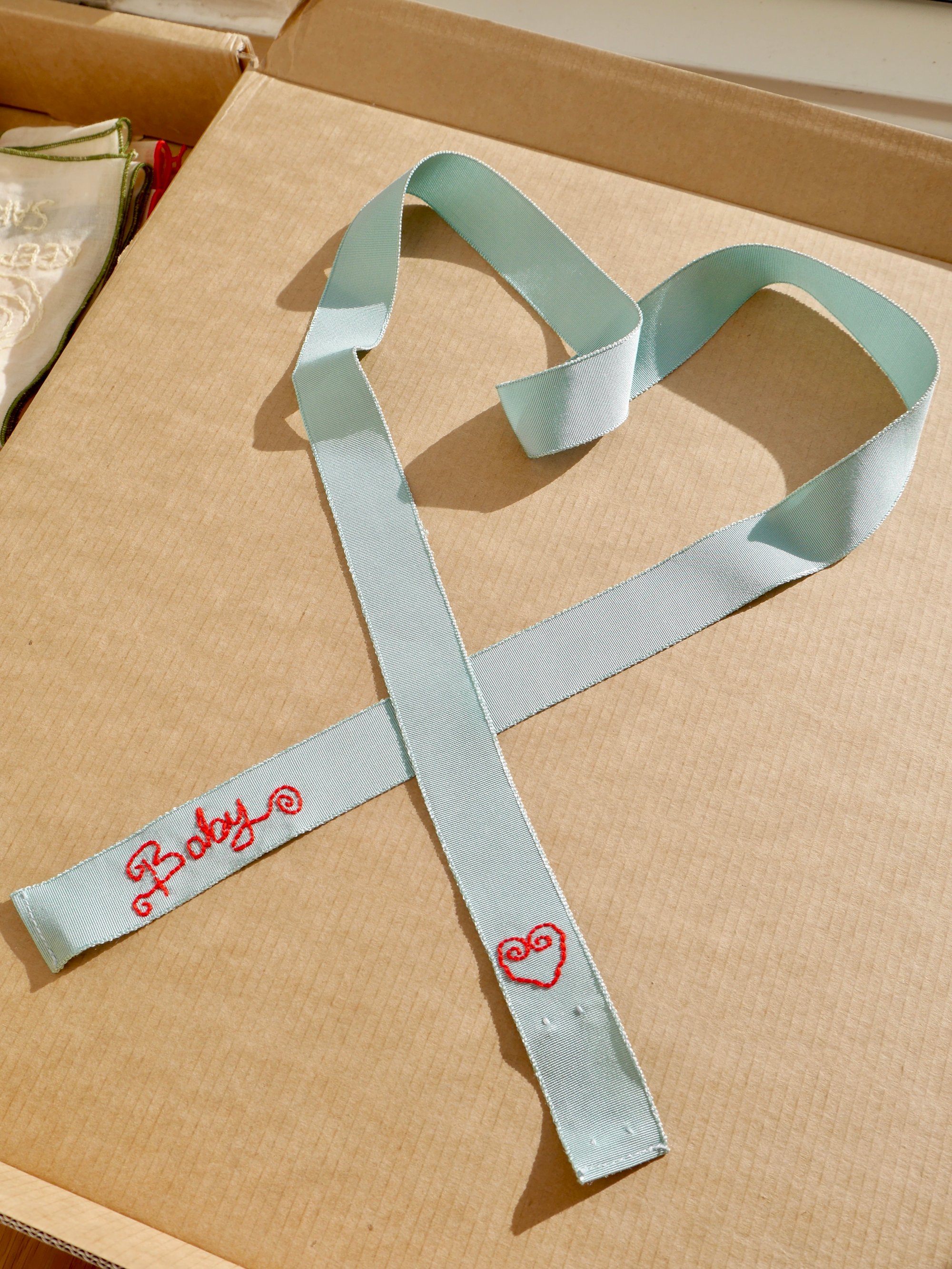 Made from vintage silk petersham ribbons, with the most exquisite edging. Hand embroidered with a swirly 'Baby' in signature red.